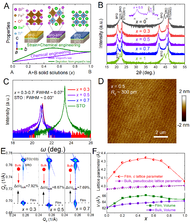 团队利用固溶体掺杂和外延应变的协同效应,在BiFeO3-BaTiO3固溶体薄膜中获得的c/a、极化强度、居里温度分别高达1.11、107μC/cm2、880℃,这不仅远高于对应的固溶体块体,而且远高于同样应变下BiFeO3和BaTiO3两个单组元薄膜。此外,与BiFeO3薄膜相比,固溶体薄膜的漏电流密度最高下降了4个数量级并且其磁化强度为BiFeO3薄膜的4倍。该研究工作不仅表明BiFeO3-BaTiO3固溶体外延薄膜在高温无铅铁电/多铁领域具有广阔的应用前景,而且也为设计新型高性能和高温无铅铁电/多铁体系提供了新的策略。